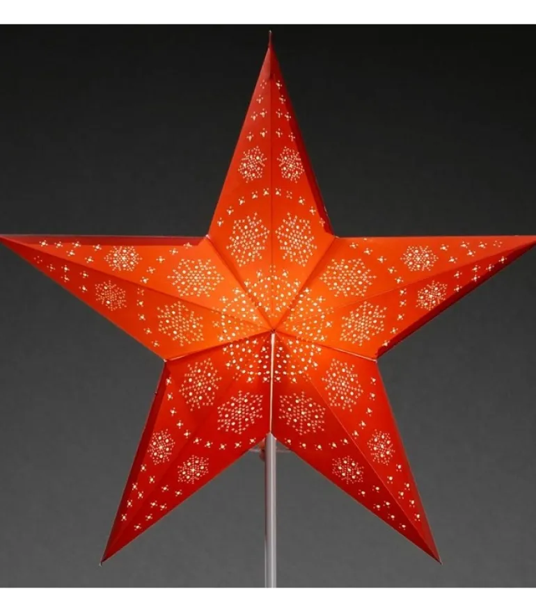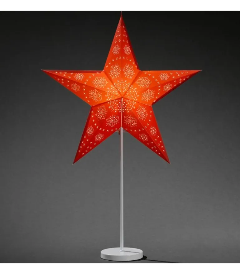 Etoile Lumineuse Electrique 5 Branches En Papier, Rouge, Sur Pied Blanc, 46 Cm