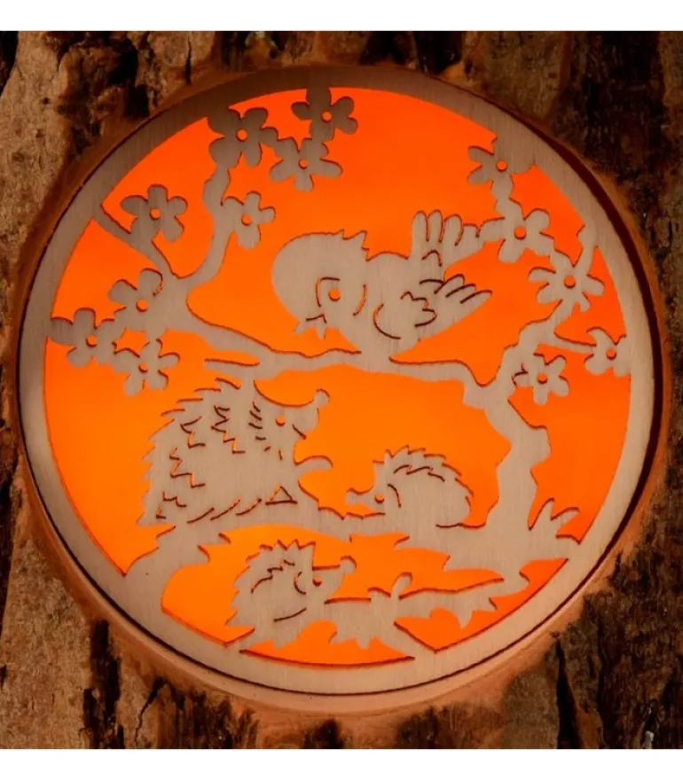 Photophore Dans Un Rondin De Bois Avec Trois Motifs Translucides : Ecureuils Et Chouettes, Chat Et Oiseaux Et Oiseau Et Herisson.