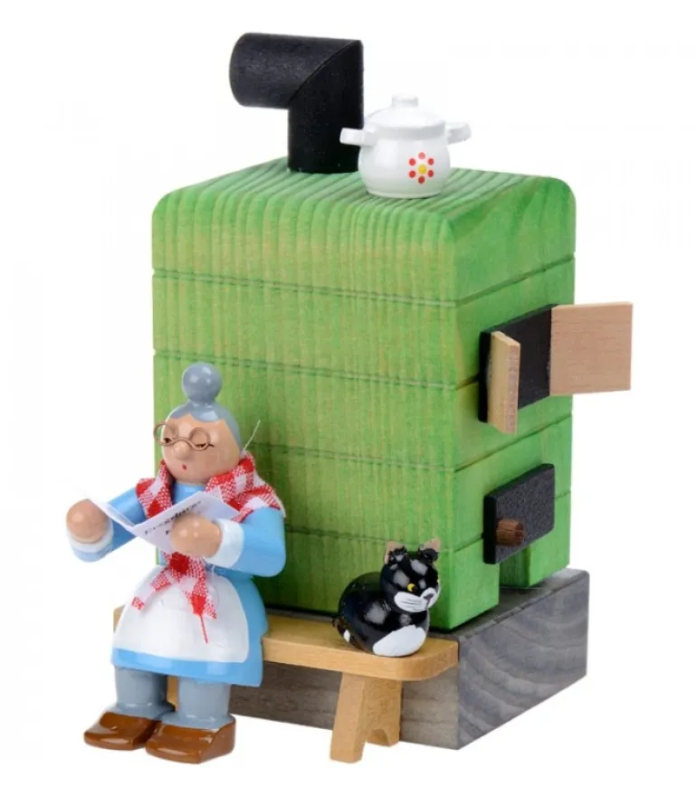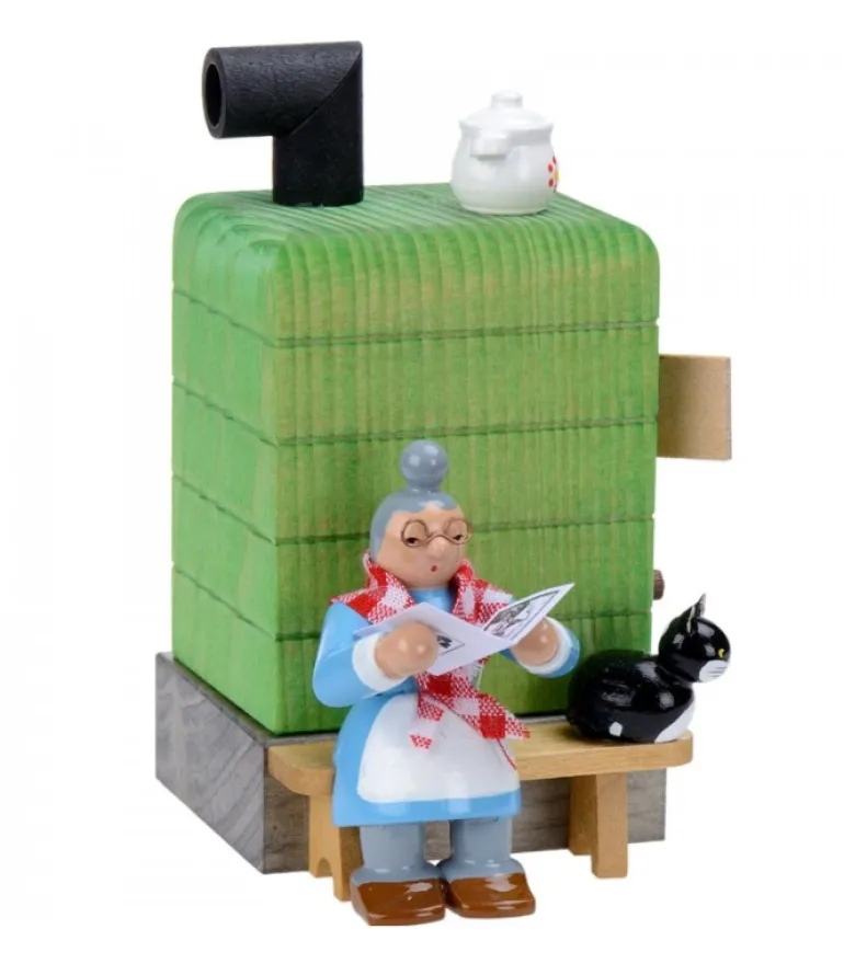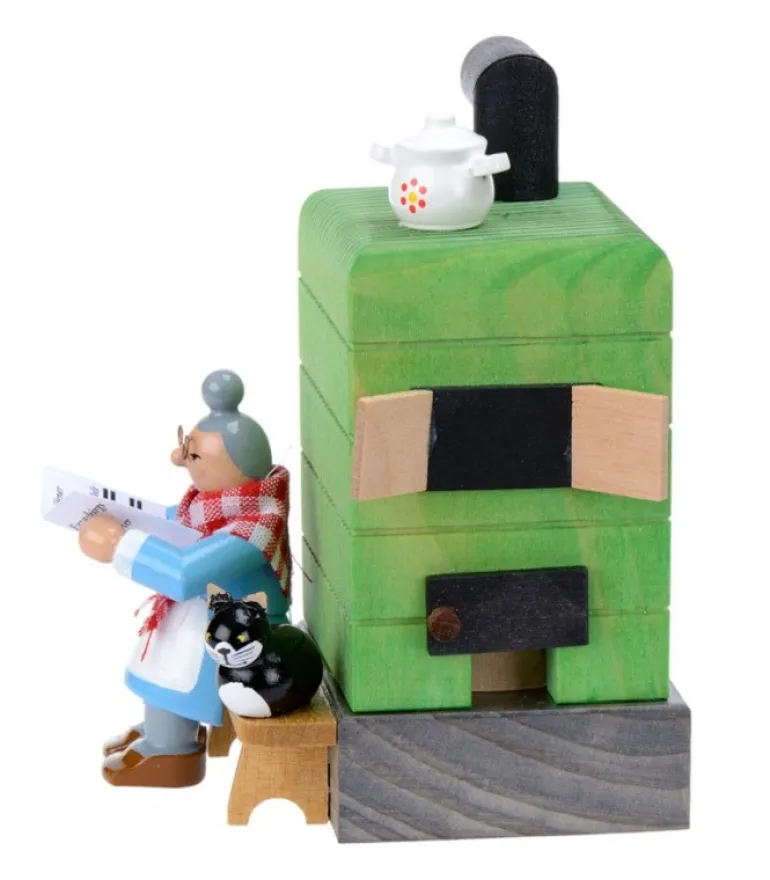 Poele En Faience Avec Grand-Mere Lisant Le Journal Et Chat.
