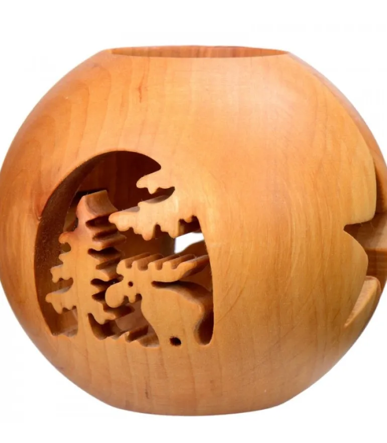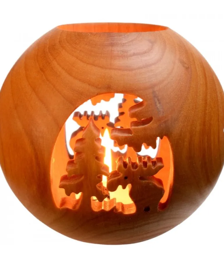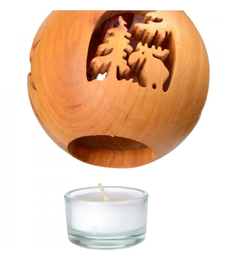 Photophore En Bois Naturel De Forme Ronde Avec Un Elan Dans La Foret Découpe Et Une Etoile Sur Les 2 Autres Faces.