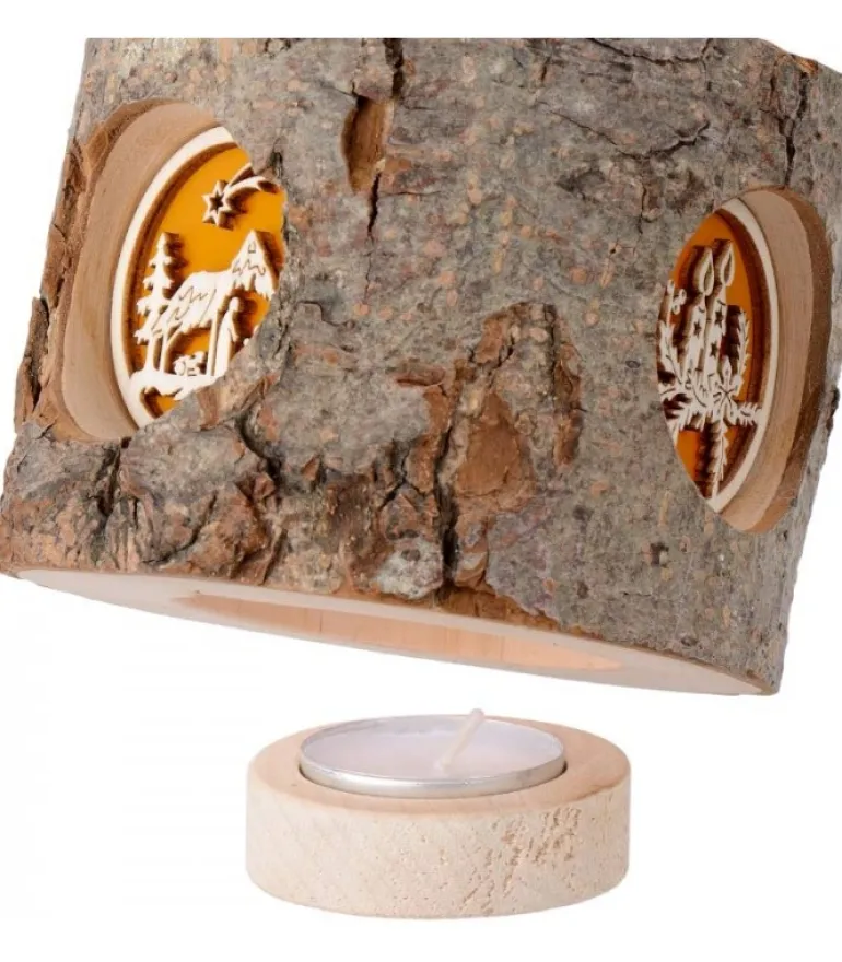 Photophore Dans Un Rondin De Bois Avec Trois Motifs Translucides : Bougies Sur Une Branche, Une Crèche Et Un Père Noël Sur Son Traineau Tire Par Des Rennes.